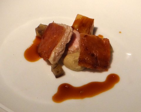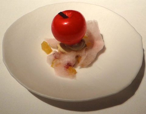 Iberian suckling pig blanquette with Riesling, mango terrine, melon and beetroot, beetroot purée, black garlic, onion and orange concentrate. Amazing technique: the suckling pig was very tender and succulent (cooked sous-vide), but the skin was amazingly crispy to the point of being brittle. Roca got inspiration from Peking duck for this dish. As a special touch, the oregano flower at the top had to be eaten last as a palate cleanser. Great pairing with another Riesling, this time Dr Bürklin Wolf Pechstein 2007 from Pfalz. 10/10