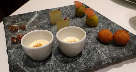There were a lot of amuse bouche before the actual menu started. The first set was basically some very simple tapas: potato croquettes, almonds, melon, olives with grapefruit (interesting but good combination), and a bacon-and-cheese mousse.