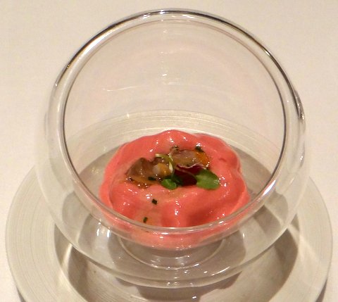 The final amuse was raw cockles with a very light beetroot mousse. The last two amuses were delicious. 9/10 for all the amuses together.