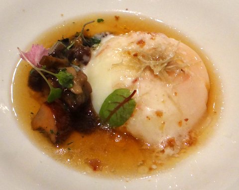 Farmhouse egg (poached sous-vide) with sautéed wild mushrooms, scented meat juice, Iberan gill and truffled cheese shard. Good. 8/10