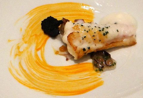 Low-temperature cooked monkfish settled on onions and paprika marmalade, braised endive with barnacles tarama and black olives. The monkfish worked well with the red wine, but was not as tender as at Librije. 8/10