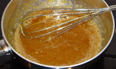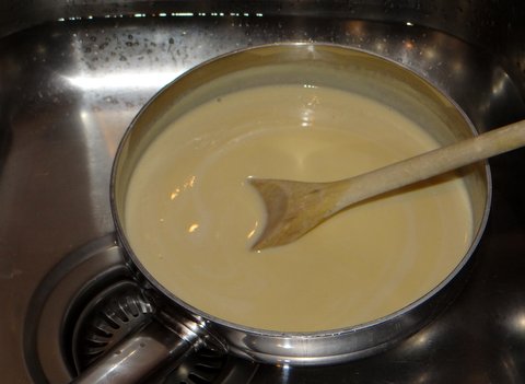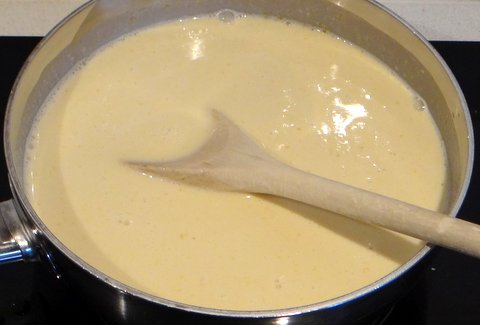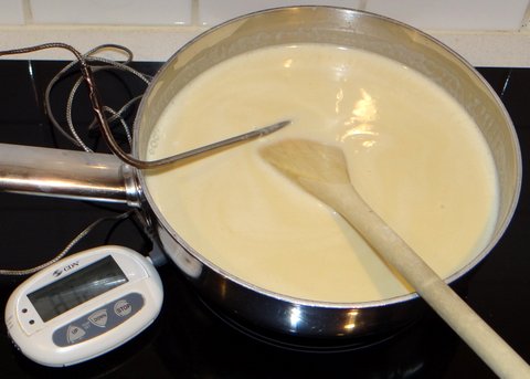 Cook over medium-high heat until a temperature of 85C/185F is reached and a custard forms. Lower the heat to medium once the temperature reaches 70C/160F to prevent burning the custard. Lower the heat quickly when 85C/185F has been reached to prevent the custard from boiling. Take off the heat, add the salt and stir to incorporate.