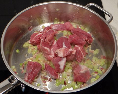 Heat 2 Tbsp olive oil in a casserole or frying pan. Add onion, garlic, celery and sauté until soft and fragrant.