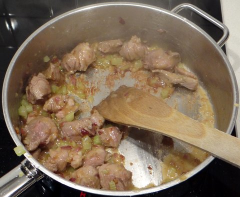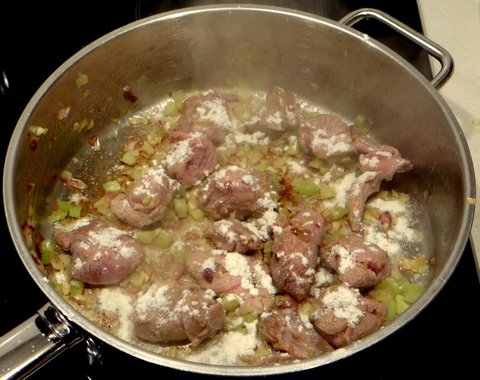 Sprinkle flour over the lamb as soon as the lamb is colored on all sides, and stir.