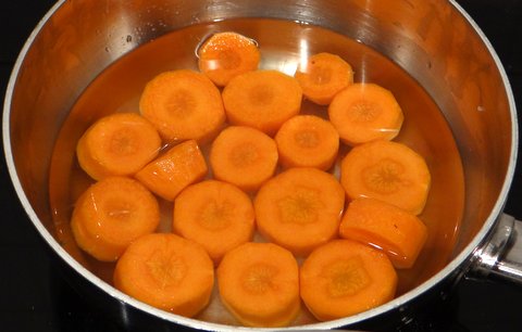 Peel and slice the carrots into 1.5 cm (1/2″) thick rounds. Boil carrots in slightly salted water until tender but still firm to the touch, about 30-45 minutes. Drain and set aside.