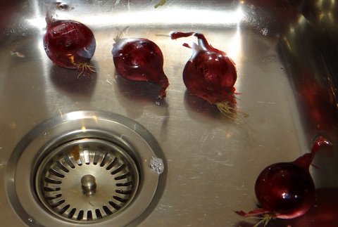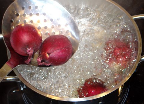 Plunge the small onions into boiling water for 20 to 30 seconds.
