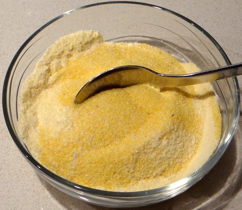 To make the polenta, first mix the fine cornmeal and the coarse corn meal.