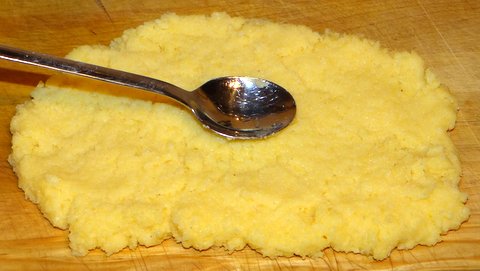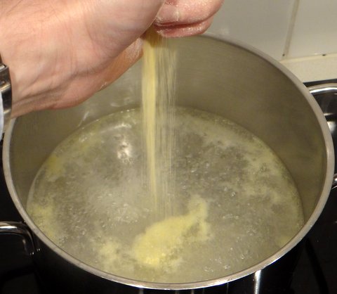Bring the water toa boil and add the salt. Lower the heat and make a ‘rain’ of corn meal in the pan.