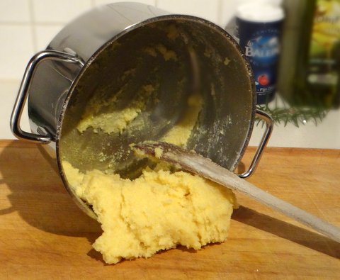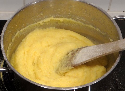 Keep stirring while you keep the ‘rain’ of cornmeal coming. To avoid lumps, it is important to keep stirring and to add the cornmeal very slowly.