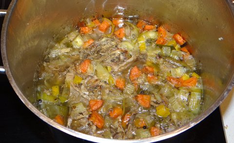 Start by taking the meat from the carcass, reserving the bones.