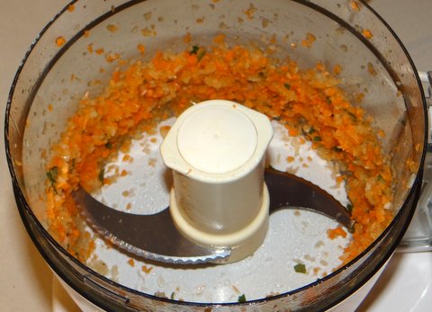 I like to use a food processor to finely mince the carrot, onion, celery, and sage.