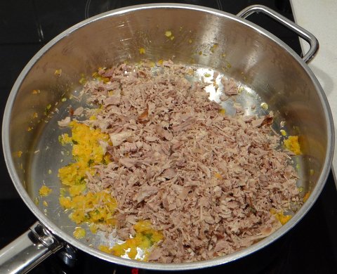 Add the chopped duck meat to the vegetables in the frying pan and stir for a minute.