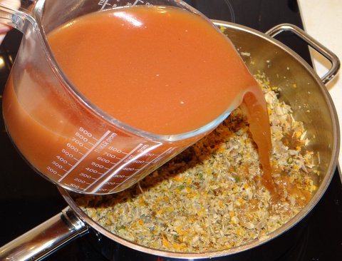 Sauté the minced vegetables in a frying pan in some olive oil until soft and fragrant and starting to turn golden, 5-10 minutes.