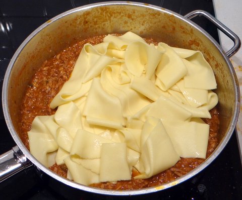 When the sauce is almost ready, bring a large pot of water to a boil, add salt and pappardelle and cook until al dente. This will only take a few minutes when using fresh pappardelle.