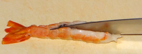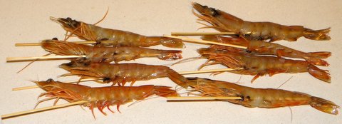 Insert a bamboo skewer as shown in each shrimp to avoid them from curling when parcooked. (Toothpicks are too short for this purpose.)