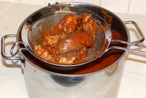 You can use a sieve or colander to get most of the sauce off of the meat.
