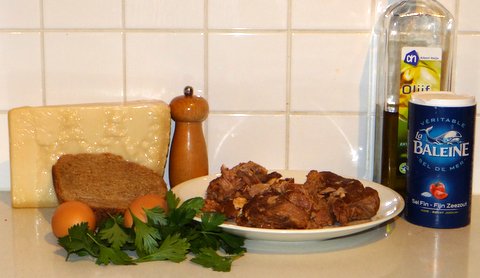 Add the bread crumbs to the meat in the bowl, together with the eggs, parsley, freshly grated parmigiano, and salt and freshly ground black pepper to taste.