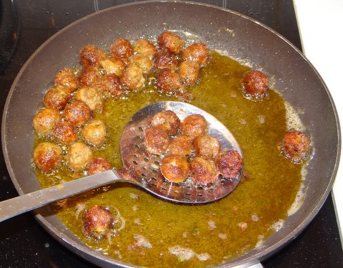 Heat an ample amount of olive oil in a non-stick frying pan over high heat and brown the meatballs in batches (they should easily fit in a single layer at a time).