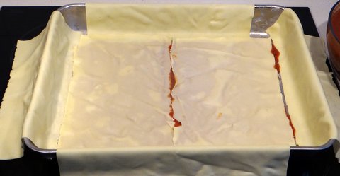 Butter a 30 x 40 cm (12 x 16 inch) lasagna dish. Arrange sheets of dough on the sides as shown. The will be folded on top of the lasagna at the end.