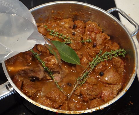 I started the ragù with cubed meat rather than ground meat since I was making the stew and the ragù at the same time. If you are only making the ragù, you could also grind the meat before browning it. You could then omit the flour and season the meat with salt and paprika after browning it. If using ground meat, do not cover the pan while simmering to avoid ending up with a ragù that is too thin.