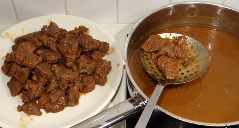 Take the meat out of the sauce with a slotted spoon and set it aside.