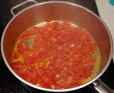 Clean the bell peppers and cut into very small dice. Heat 2 Tbsp olive oil over high heat and add the bell pepper.