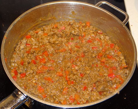 Add the sauce and the ground meat to the bell pepper and stir to mix.