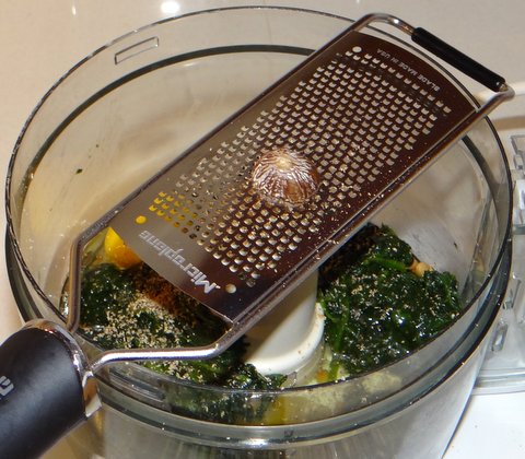 Put the spinach, eggs, and 2/3 of the pine nuts in the bowl of the food processor. Season with salt and freshly ground black pepper. Add freshly grated nutmeg to taste.