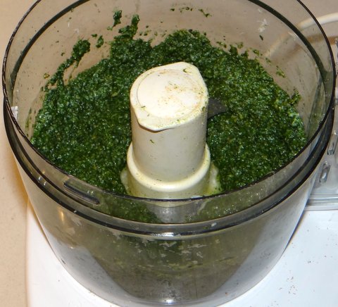 Process until smooth and homogeneous. The pine nuts do not have to be finely ground, but you don’t want whole pine nuts in there either.