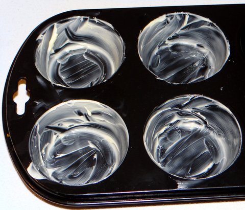 Butter 4 positions in a muffin pan. (Each muffin holder should be about 100-120 ml, 1/2 cup or a bit less. You can also use ramekins of that size.)