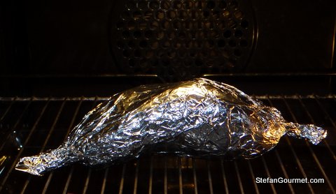 Preheat the oven to 225C/440F. Wrap the sweet potato(es) in foil and bake them until tender, about 1 hour.