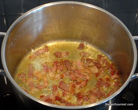 Heat 1 Tbsp clarified butter in a casserole into which the chicken legs will fit snugly. Add the lardons and sauté until golden.