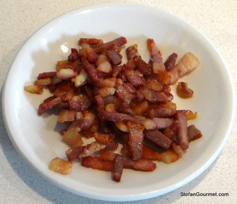 I have looked at various recipes online, most of them in French, and noted that they are all very similar. Chicken is browned, covered in red wine and stock, and then stewed until tender. It is served with sautéed mushrooms and braised pearl onions. Since Julia Child has been very important for introducing French cuisine to America, I thought it would be nice to follow her recipe from Mastering the Art of French Cooking. She made some adaptations to ingredients available in America, for instance she cooks the chicken only for a short time (because young chickens don’t need that long) and she blanches the bacon before using it (I think this is because bacon in America was — or still is? — too salty).