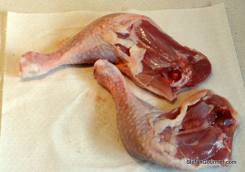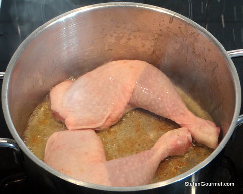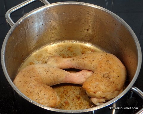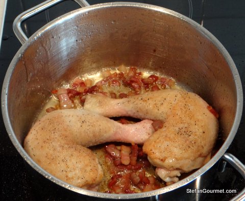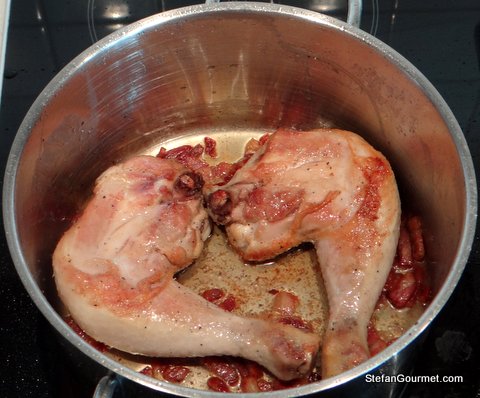 Brown the chicken legs in the hot butter and bacon fat on both sides.