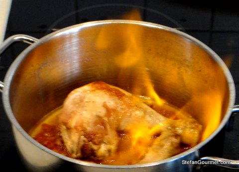 Ignite the cognac with a match (being careful not to burn yourself). Wait until the flames subside, shaking the casserole gently.