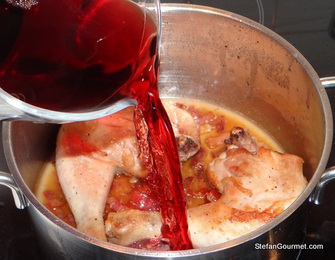 This pairs well with a light to medium-bodied red wine, especially a pinot noir from Bourgogne. A strong red wine would overpower the chicken. The wine pairing will work very well if you use the same or a very similar wine for the sauce.