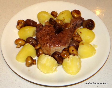 Arrange the chicken with the mushrooms, onions, and potatoes on warm plates.