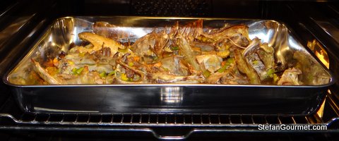 Good quality chicken is often sold as whole chickens. I take off the legs and breast, and use the rest to make stock. When making stock from bones, chefs differentiate between ‘white’ stock and ‘brown’ stock. The difference is that white stock is made from raw or blanched bones, whereas for brown stock the bones are roasted first. Brown stock has a more rich, fuller flavor than white stock. For the best Coq au Vin sauce, it is best to use a brown stock. Since I posted about Coq au Vin the other day, I thought I’d share a recipe for brown chicken stock with you. Please note that I did not include salt in the recipe because it is never a good idea to add salt to stock before you know what you are going to do with it. You may have to simmer the stock down to make a sauce, and then it may end up too salty.