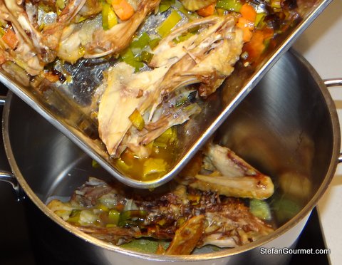 Transfer the contents of the oven dish to a stock pot, including the juices.