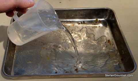 Add the water from the oven dish to the stock pot. Add more water until you have added about 1 liter (1 quart). Add a bit more if needed to cover the bones and vegetables.