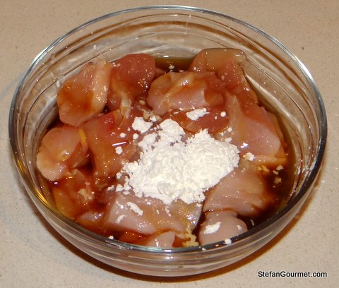 Combine the chicken in a bowl with 1 tsp corn starch, 1/2 tsp sesame oil, 1 tsp soy sauce, and 1 tsp shaohsing rice wine.