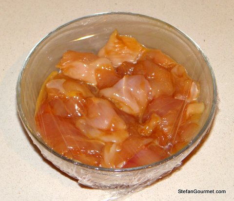 Stir until well mixed and the chicken is coated with the marinade on all sides. Cover with plastic wrap and marinate for about 25 minutes at room temperature.