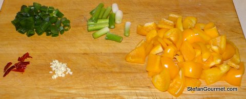 Meanwhile, prep the veggies. Clean the bell peppers and cut into pieces about the size of the chicken. Chop the green onions and separate the green part. Mince the garlic. Roughly chop the dried chile peppers and remove the seeds.