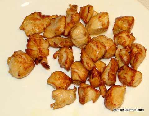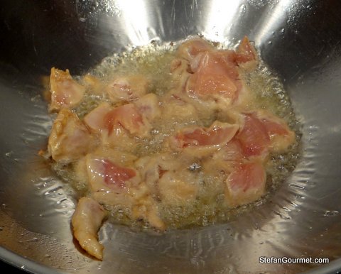 Add the chicken when the oil is very hot. Stir-fry just until golden.