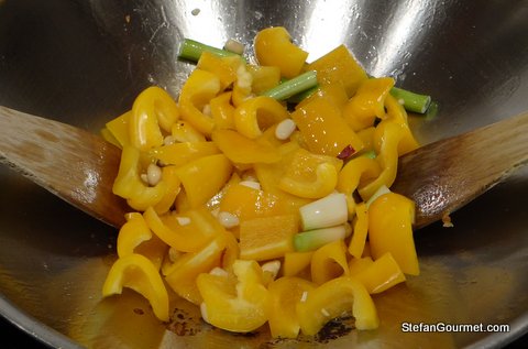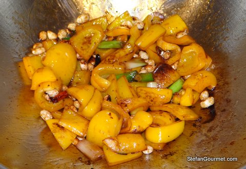Add the bell pepper, chile peppers, garlic, and white part of the green onions to the wok. Add the peanuts as well if using raw peanuts. If you like your peanuts well-roasted, you could even start by roasting them first. Stir-fry for a few minutes.