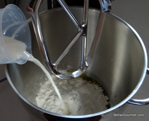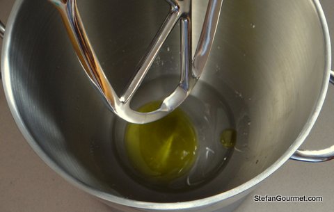 Combine the remaining water with the salt and olive oil in the bowl of a stand mixer.