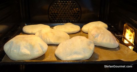 Bake the pita bread at 230C/450F until puffed up and slightly golden, about 10 minutes.