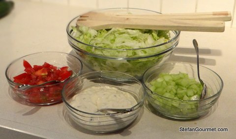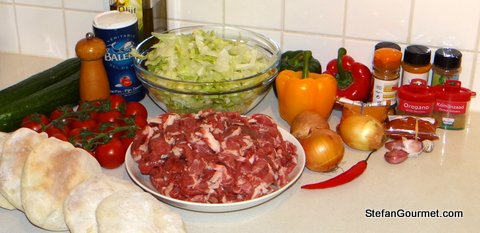 Serve the meat with the pita bread, diced tomatoes, diced cucumber, iceberg lettuce, and garlic sauce.