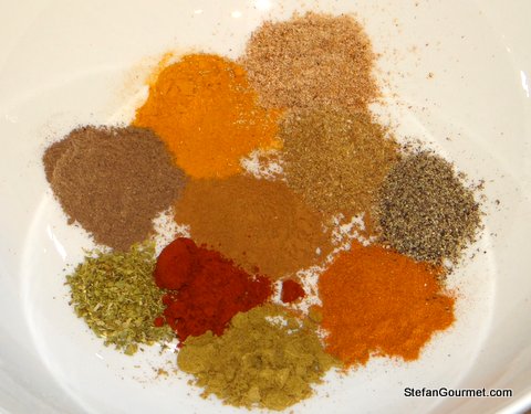 Mix all the spices together, then mix with the meat. Allow to marinate for 90 minutes at room temperature.