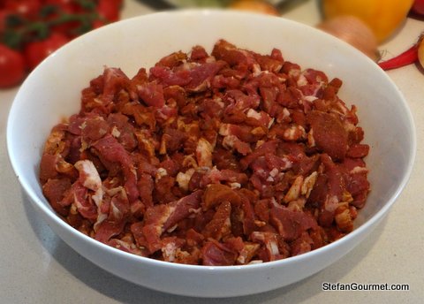 Shawarma is originally made using lamb, but it is also made with chicken or even pork. The latter is certainly not authentic, given the Middle-Eastern origin of the dish. However because of the spices you probably won’t taste the difference anyway, so pork can be a cheap but acceptable substitute. I used a mixture of lamb shoulder, lamb neck, and leg of lamb. It is important to use meat with some fat, because fat meat has more flavor. Even though the word shawarma has been derived from the Turkish word for “turning”, you do not have to own a vertical spit to prepare it. As the meat is sliced thinly, it can be stir fried just as easily.